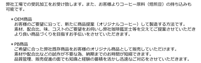 | コーヒー原料 | 弊社工場での受託加工をお受けいたします、また、お客様よりコーヒー原料(焙煎豆)の持ち込みも可能です。 |